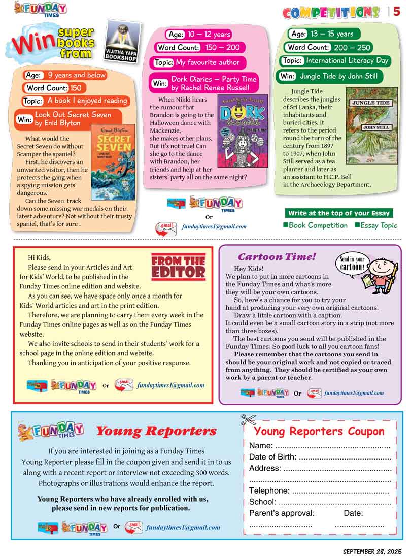 Funday Times is the children’s section of the Sunday Times newspaper. The paper carries a wide range of activities and reading materials to interest children from 4 to 15 years. It also features articles from our young reporters, art and short articles from children. The Funday Times website aims to complement the activities of the publication by furthering young reader engagement and learning.